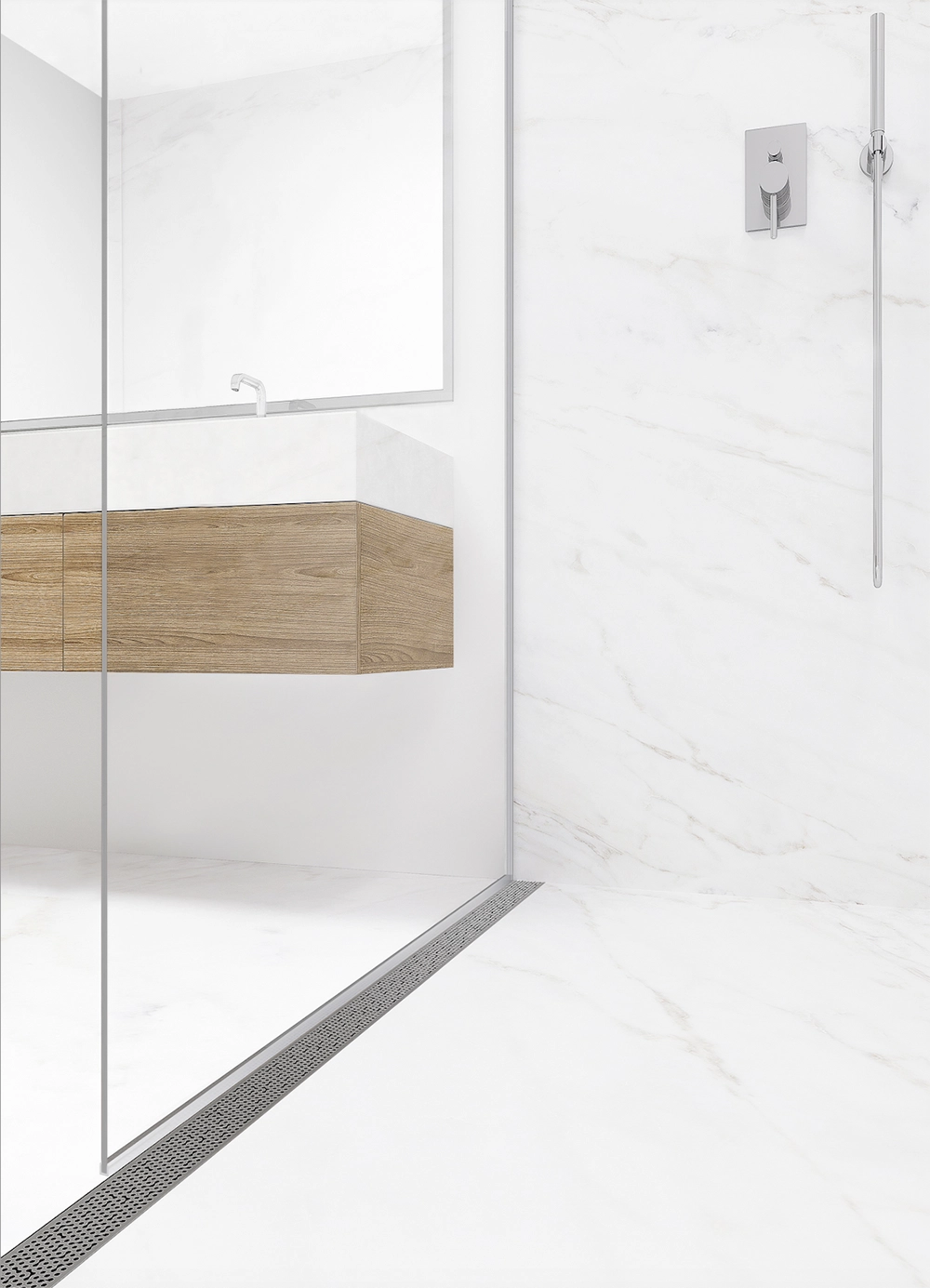The Adhesion linear drain is inspired by the science of adhesion, where water droplets stick to a variety of surfaces to form unique patterns.