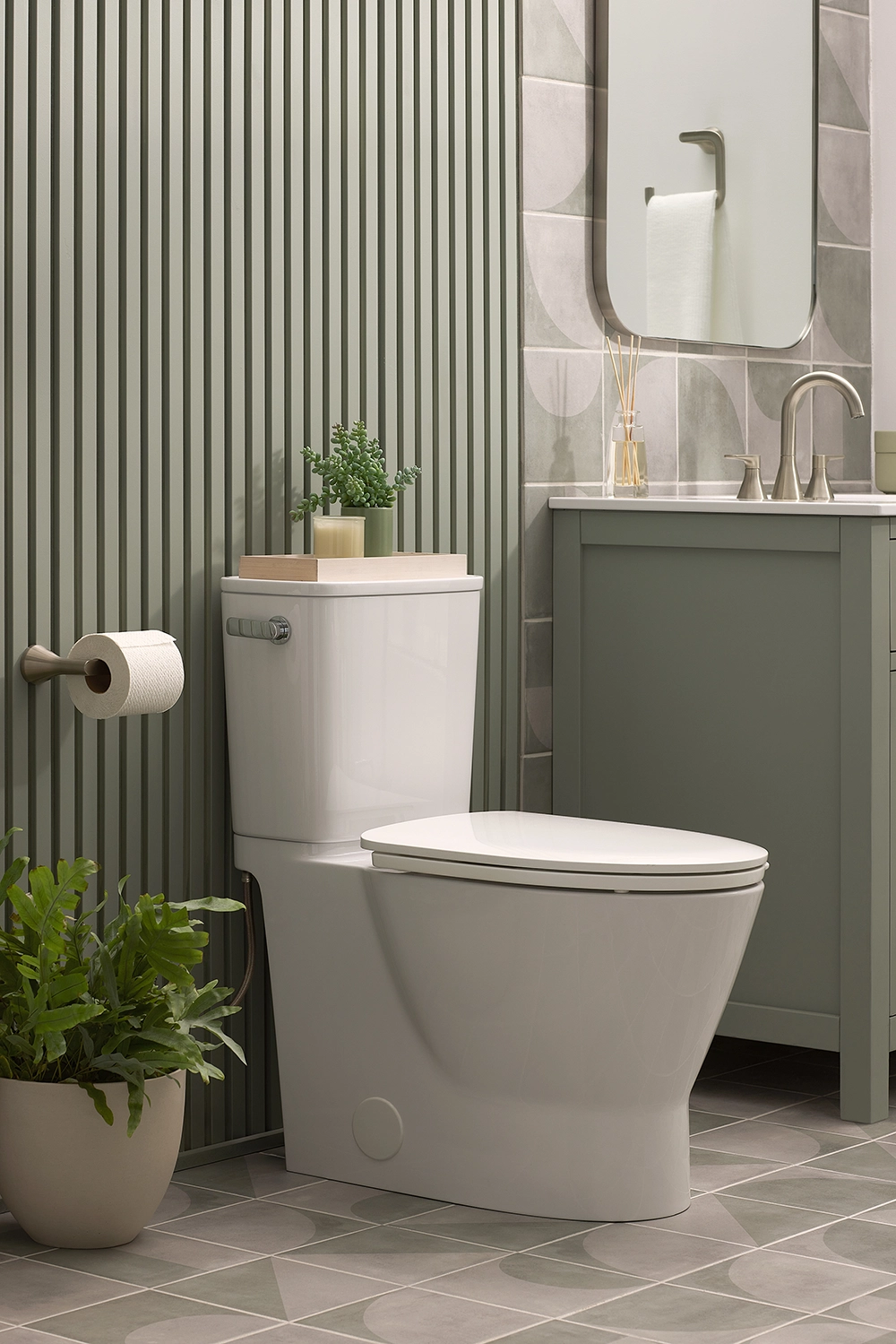 The Aspirations Two-Piece Skirted Chair-Height Elongated Toilet from American Standard is a sleek, smooth-sided toilet that conceals the trapway, eliminating hard-to-reach areas where dust and dirt can hide, for quick, easy cleaning. Using our Everclean surface, we’ve eliminated the ability for bacteria, mold and mildew to grow. This high-efficiency toilet uses 20% less water than a standard toilet while delivering the reliable flushing power that has made American Standard an industry leader.