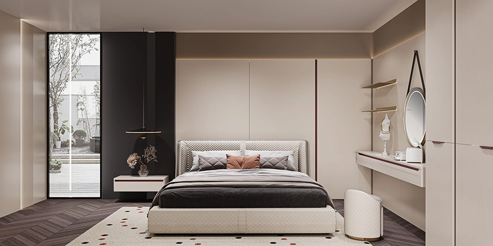 The overall space is dominated by warm white color tones, paired with gray black and coffee, with artistic texture patterns decorating the back panel and deep red linear handles embellishing it, creating a visually impactful effect.