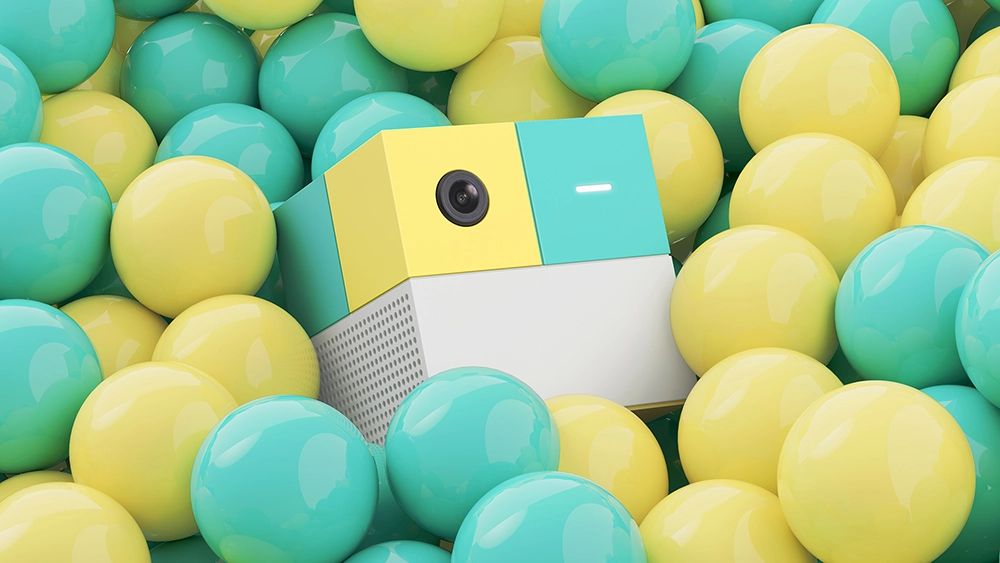 Embodying an anthropomorphic character, the primitive shapes are balanced with personality, achieved by leveraging the system’s camera lens and LED indicator to create a subtle winking eye – another nod to childhood imagination. The “monocle” provides a physical camera cover for those wanting reassurances around privacy, leaning into the sweet character of the hardware.
