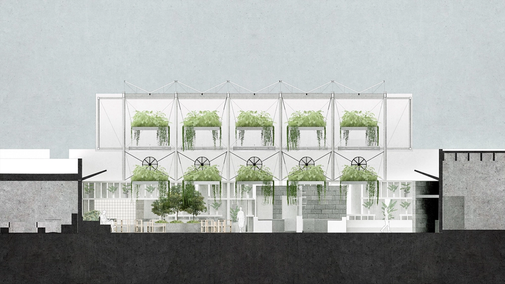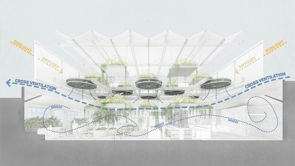 At the heart of the courtyard lies a suspended garden, seamlessly blending the urban and natural environment. The soaring triple-height space, adorned with hanging planters and solar shades, creates a captivating scene that fosters a connection between humanity and nature, promoting well-being for all patrons.