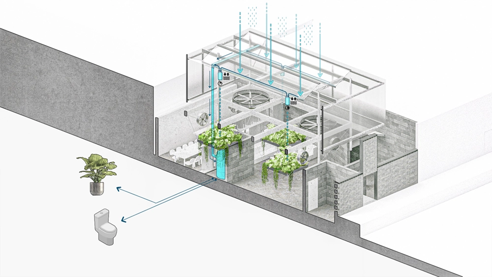 Water harvesting is a prominent eco-friendly practice, reducing runoff and preserving water quality. It promotes healthy plant growth and lessens the strain on local water sources, demonstrating the project’s eco-conscious approach and contribution to the community’s water conservation efforts. The project showcases an innovative butterfly roof for rainwater collection that feeds into the system of plant life and gray water use while reflecting its commitment to sustainability.
