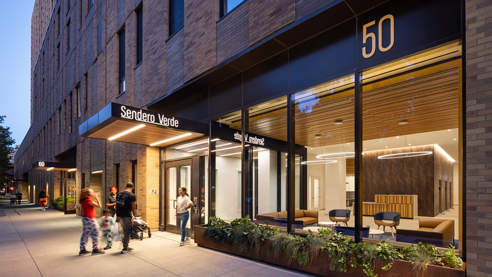 Sendero Verde comprises 709 residential units as well as extensive community space, retail space, and outdoor gardens. A school also operates in the space, as well as supportive programming operated by Union Settlement, which is one of the oldest settlement houses in New York City. Ground floor retail wraps the site.