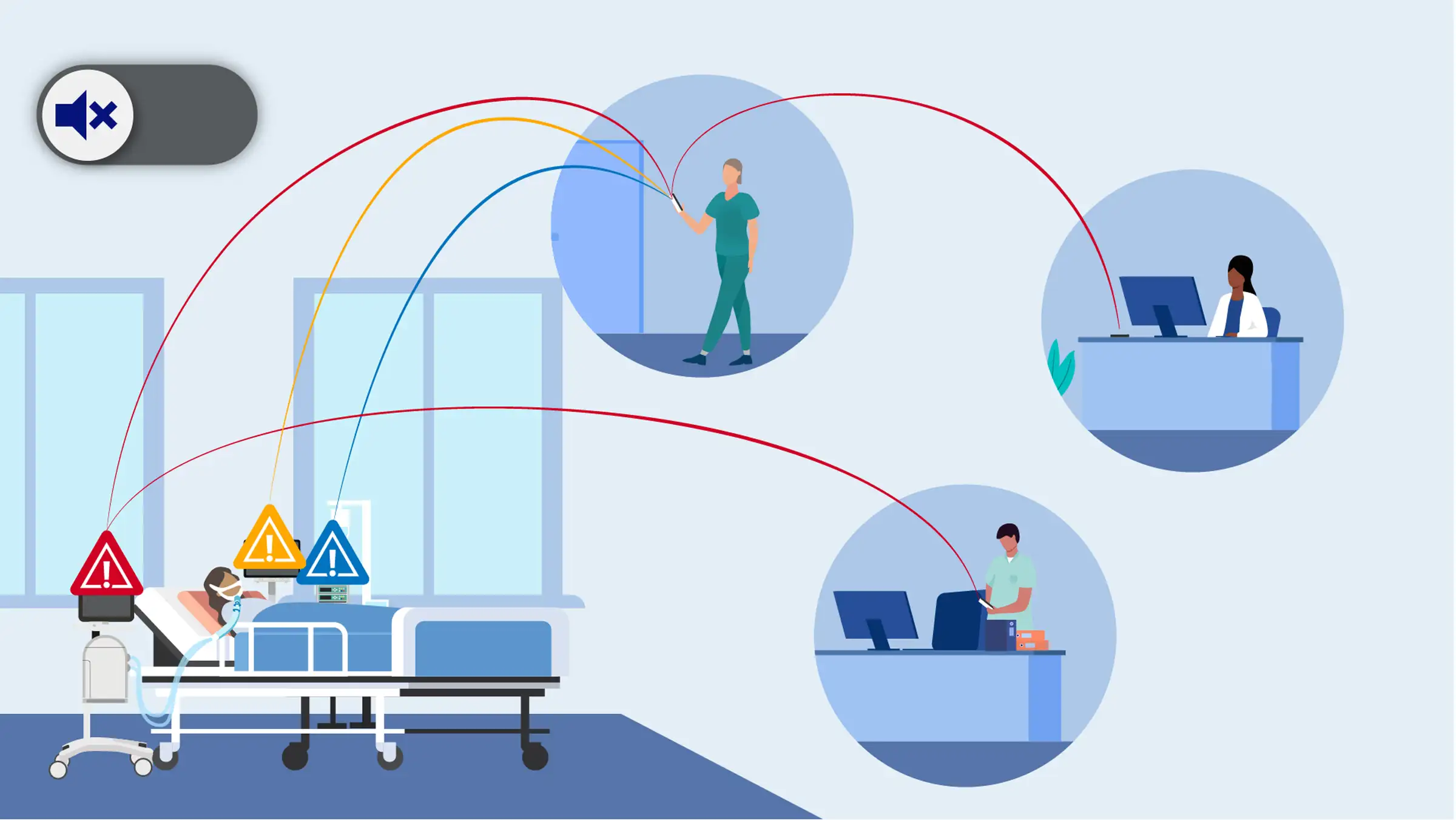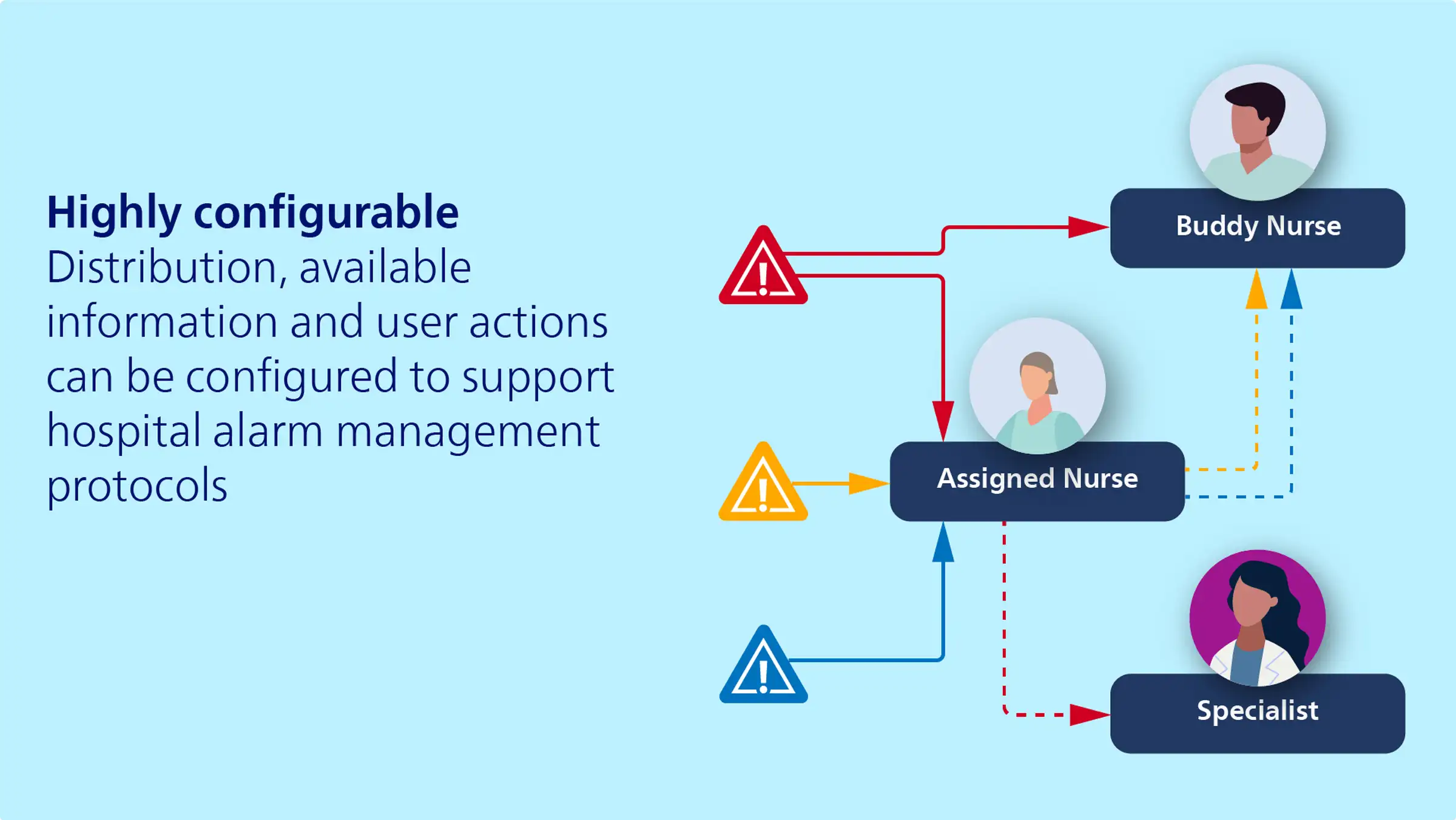 This solution leverages interoperability protocols, specifically the IEEE 11073 Service-oriented Device Connectivity (SDC) standard, to enable bi-directional communication between point-of-care devices through seamless integration across different manufacturers. The system is highly configurable to support specific hospital alarm protocols and workflows, offering flexibility for diverse healthcare environments and allowing efficient alarm redistribution. Nurses can acknowledge alarms on their mobile devices to prevent unnecessary escalation and respond promptly.