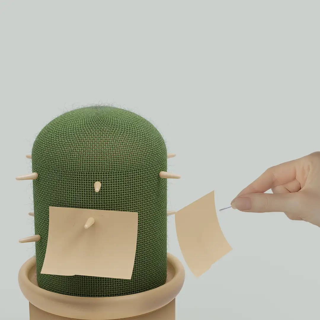 The main body features foam wrapped in soft felt, offering both a tactile warmth and a welcoming visual appeal. Users can pin notes, sketches, or reminders using uniquely shaped “cactus thorn” pins, making display and organisation intuitive and interactive. The base, designed to resemble a flowerpot, cleverly conceals a compartment for rolled sticky notes—maximising space efficiency while maintaining a clean, minimalist look.